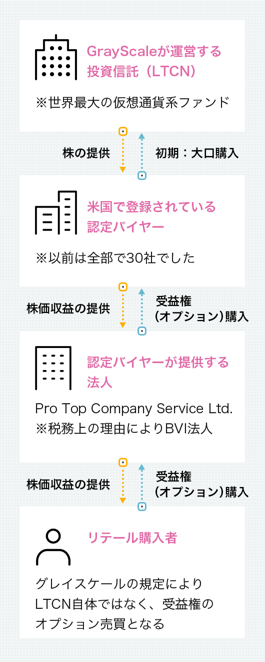 また受益権購入者は、あくまでLTCNの株を売買するのではなく、損益のみを売買する権利、それがLTCN-OPです。