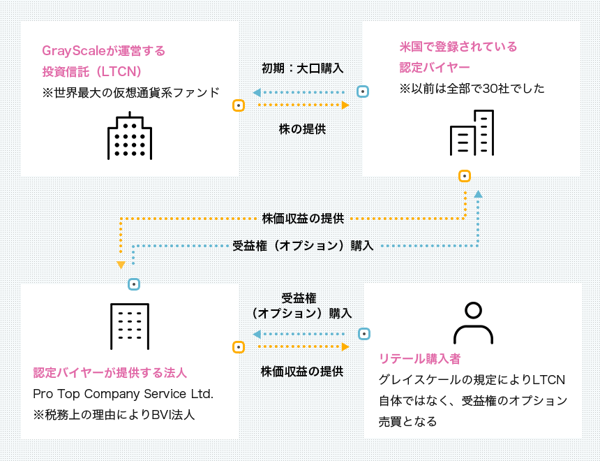 また受益権購入者は、あくまでLTCNの株を売買するのではなく、損益のみを売買する権利、それがLTCN-OPです。